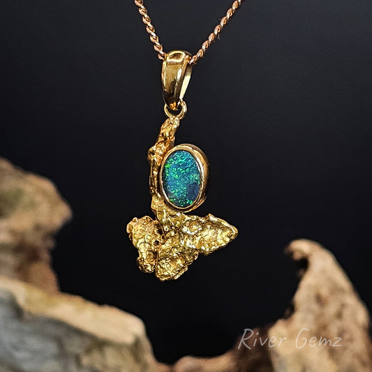 Australian Black Opal & Gold Nugget in 18K Pendant [#367]