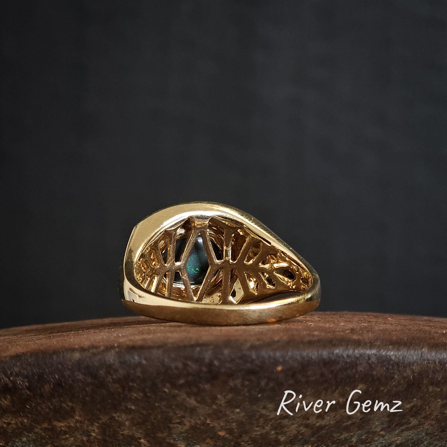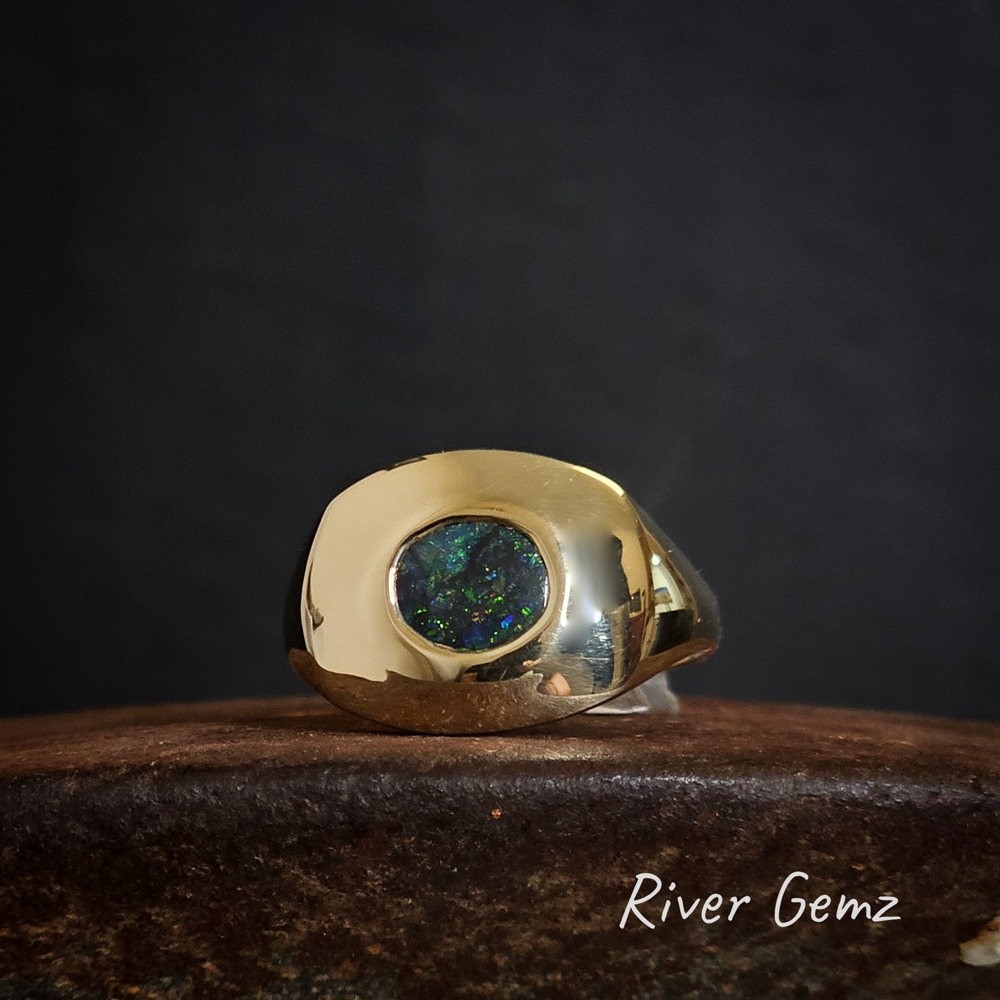 Encased in a robust 14K yellow gold bezel, the opal is elegantly elevated, drawing the eye and allowing the myriad of colours to dance in the light. The ring's chunky design is not only striking but also offers a substantial presence on the finger, making it a perfect statement piece for the modern man. The wide gold surround not only enhances the opal's natural beauty but also provides a sturdy and comfortable fit, ensuring it can be worn with confidence on any occasion.